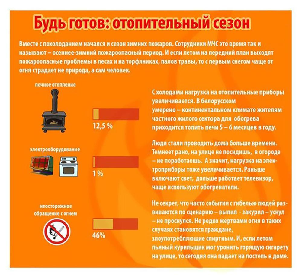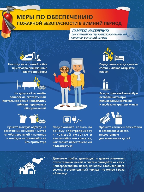 С наступлением холодов в значительной мере увеличивается опасность возникновения пожаров и отравлений угарным газом. Основными причинами возгорания в этот период являются: неправильное устройство и эксплуатация вентиляционных каналов и дымоходов, нарушение правил эксплуатации газовых приборов, неосторожное обращение с огнем. Очень жаль, что многие пренебрегают очевидными нормами пожарной безопасности и, как следствие, собственным здоровьем и жизнью.