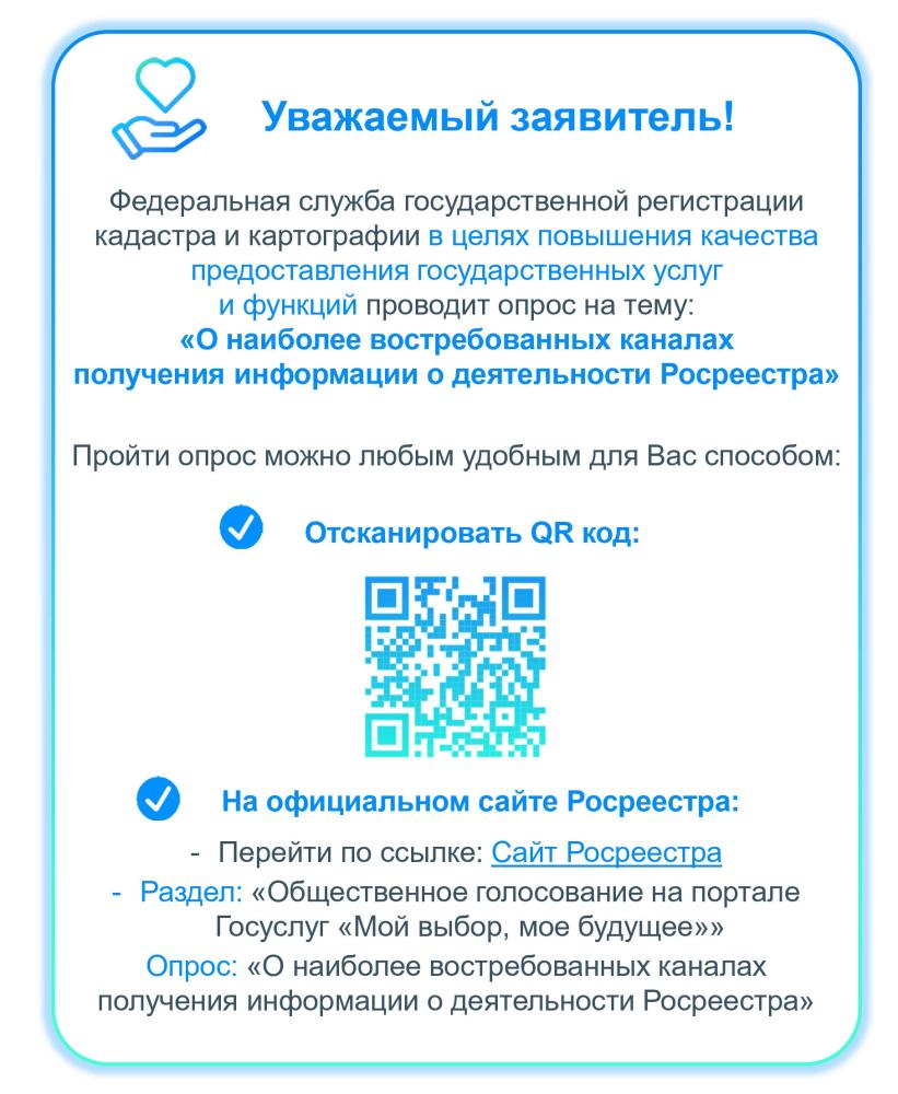 К опросу также можно перейти по QR – коду или по ссылке: Опрос о наиболее востребованных каналах получения информации о деятельности Росреестра.